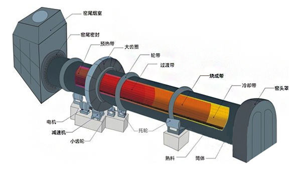 回轉窯(旋窯)是一個有一定斜度的圓筒狀物,斜度為3~3.5%,借助窯的轉動來促進料在回轉窯(旋窯)內攪拌,使料互相混合、接觸進行反應。窯頭噴煤燃燒產生大量的熱,熱量以火焰的輻射、熱氣的對流、窯磚(窯皮)傳導等方式傳給物料。物料依靠窯筒體的斜度及窯的轉動在窯內向前運動。