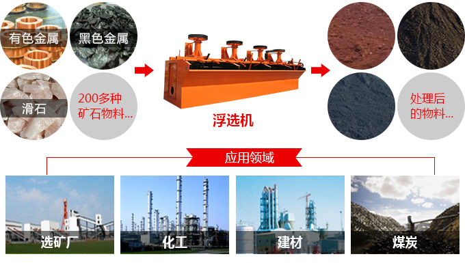 浮選機(jī)主要用于選別金、銀、銅、鐵、鉛、鋅、鉬、鎳、鋁等金屬礦物。也可以用 于黑色金屬和非金屬的選別。該機(jī)由電動(dòng)機(jī)三角帶傳動(dòng)帶動(dòng)葉輪旋轉(zhuǎn),產(chǎn)生 離心作用形成負(fù)壓,一方面吸入充足的空氣與礦漿混合,一方面攪拌礦漿成 藥物混合,同時(shí)細(xì)化泡沫,使礦物粘合在泡沫之上,浮到礦漿面再形成礦化 泡沫。調(diào)節(jié)閘板高度控制液面,使泡沫被刮板刮出。