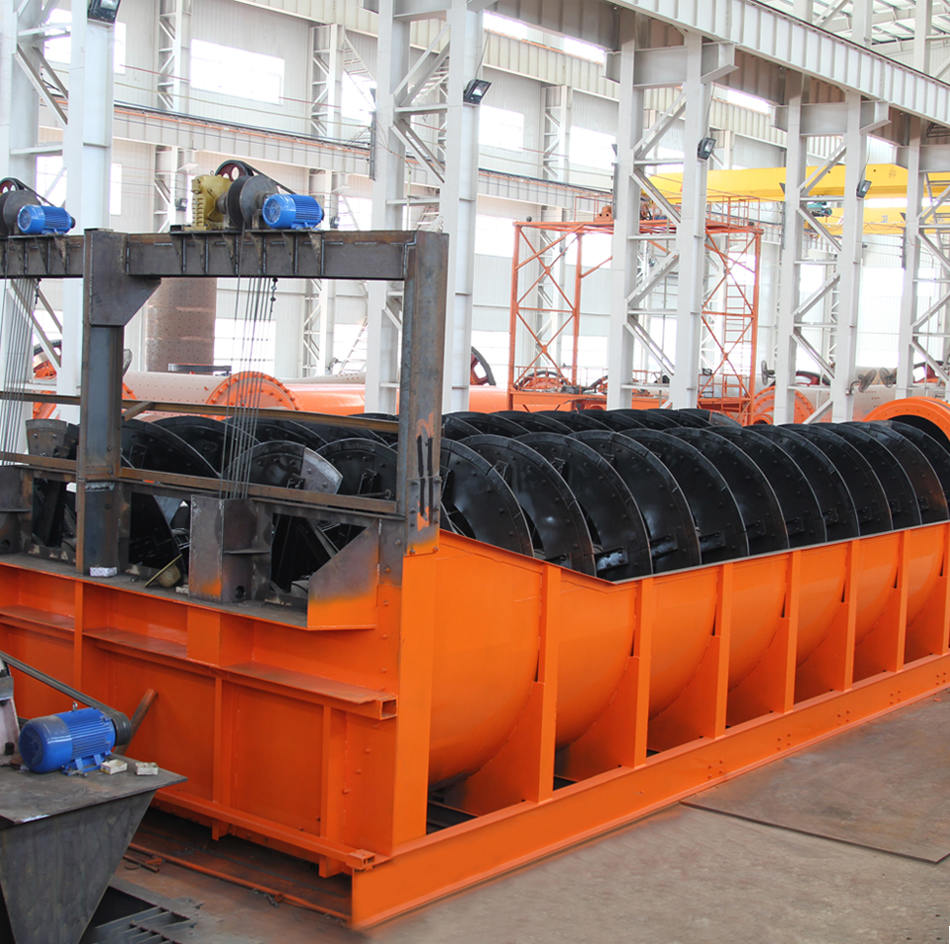分級(jí)機(jī)工作原理:分級(jí)機(jī)是借助于固體粒大小不同,比重不同,因而在液體中的沉降速度不同的原理,細(xì)礦粒浮游在水中成溢流出,粗礦粒沉于槽底。由螺旋推向上部排出,來進(jìn)行機(jī)械分級(jí)的一種分級(jí)設(shè)備,能把磨機(jī)內(nèi)磨出的料粉級(jí)加于過濾,然后把粗料利用螺旋片旋片旋入磨機(jī)進(jìn)料口,把過濾出的細(xì)料從溢流管子排出。該機(jī)底座采用槽鋼,機(jī)體采用鋼板焊接而成。螺旋軸的入水頭、軸頭、采用生鐵套,耐磨耐用,提升裝置分電動(dòng)和手動(dòng)兩種。