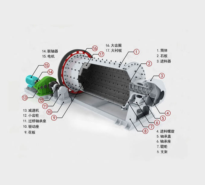 球磨機(jī)由給料部、出料部、回轉(zhuǎn)部、傳動(dòng)部(減速機(jī)、小傳動(dòng)齒輪、電機(jī)、電控)等主要部分組成。中空軸采用鑄鋼件,內(nèi)襯可拆換,回轉(zhuǎn)大齒輪采用鑄件滾齒加工,筒體內(nèi)鑲有耐磨襯板,具有良好的耐磨性,本機(jī)運(yùn)轉(zhuǎn)平穩(wěn),性能可靠,根據(jù)物料及排礦方式,可選擇干式球磨機(jī)和濕式球磨機(jī)。